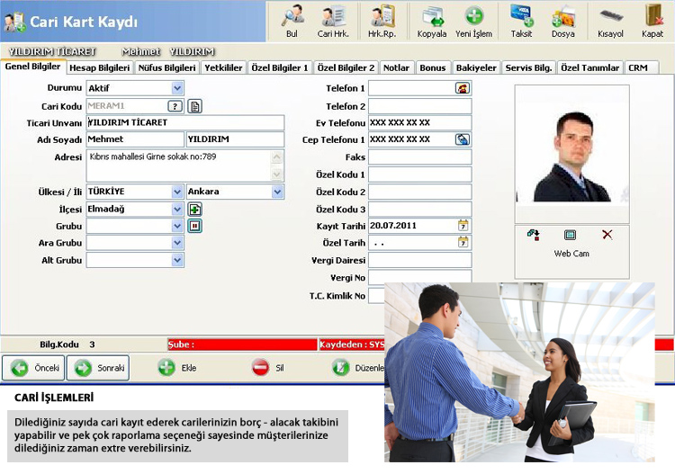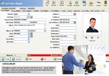 * Cari kartlara ait genel bilgiler, hesap bilgileri, özel iskonto, vade, stok fiyat seçimi, yetkili, servis bilgisi tanımlayabilir,