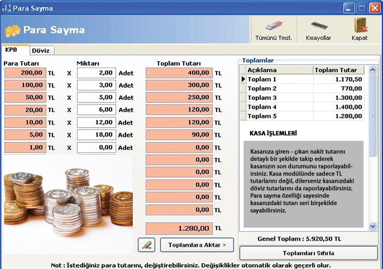 * Günlük ve genel kasa raporları alarak kasanızdaki net nakit tutarını görüntüleyebilir,