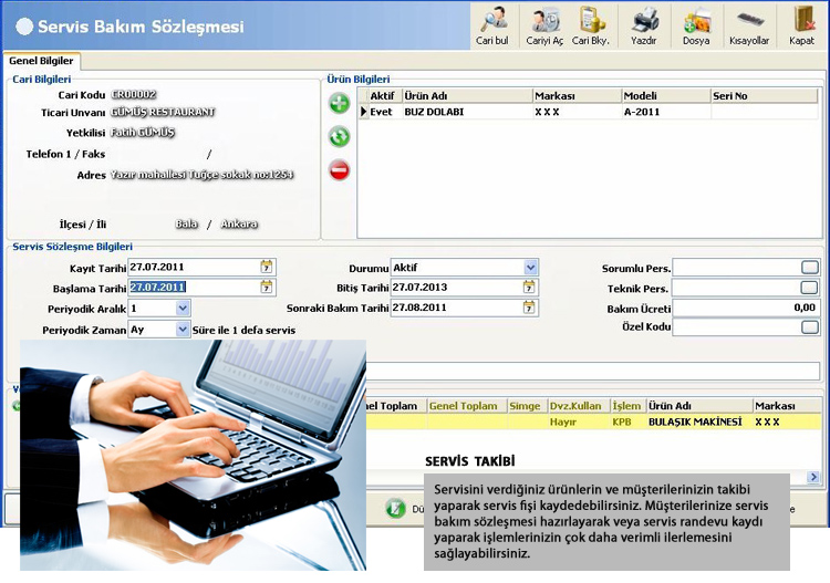* Servis fişlerinde teslim eden, teslim alan, teslim saati, ürün bilgileri, bildirilen arızalar ve yapılan işlemleri kaydedebilir,