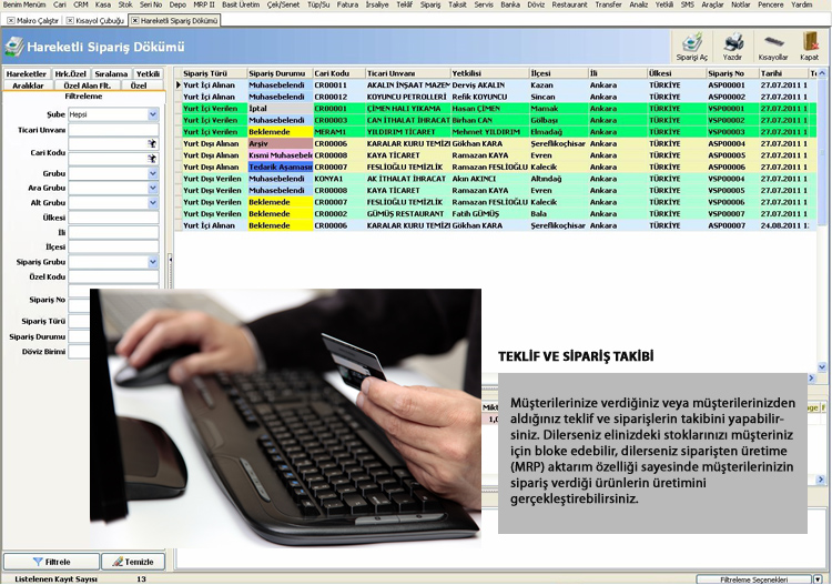 * Stok sipariş listesini ve kayıtlı tüm siparişlerinizi raporlayabilir,