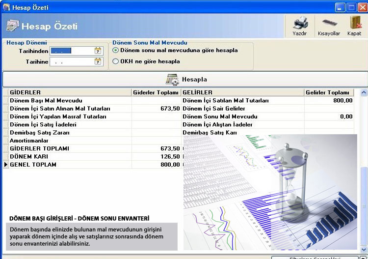 * Hesap özeti dönem başı mal mevcudu veya ortalama kar haddi raporuna göre hesaplatabilme seçeneği,
